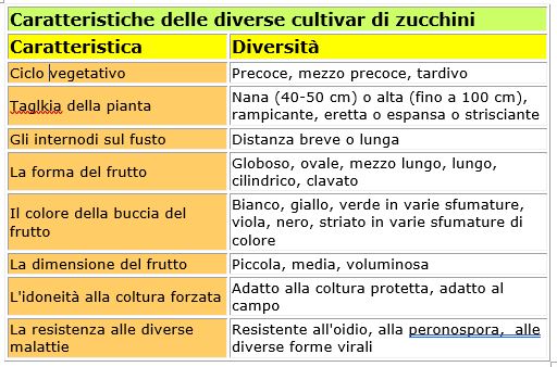 Nella tabella qui sotto riassumiamo le diverse caratteristiche esterne distintive degli zucchini. Le varietà sono centinaia, riferitevi a fornitori di sementi affidabili oppure acquistate le piantine solo presso vivai di fiducia.